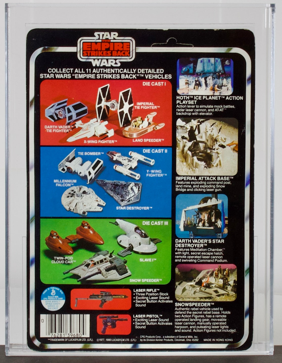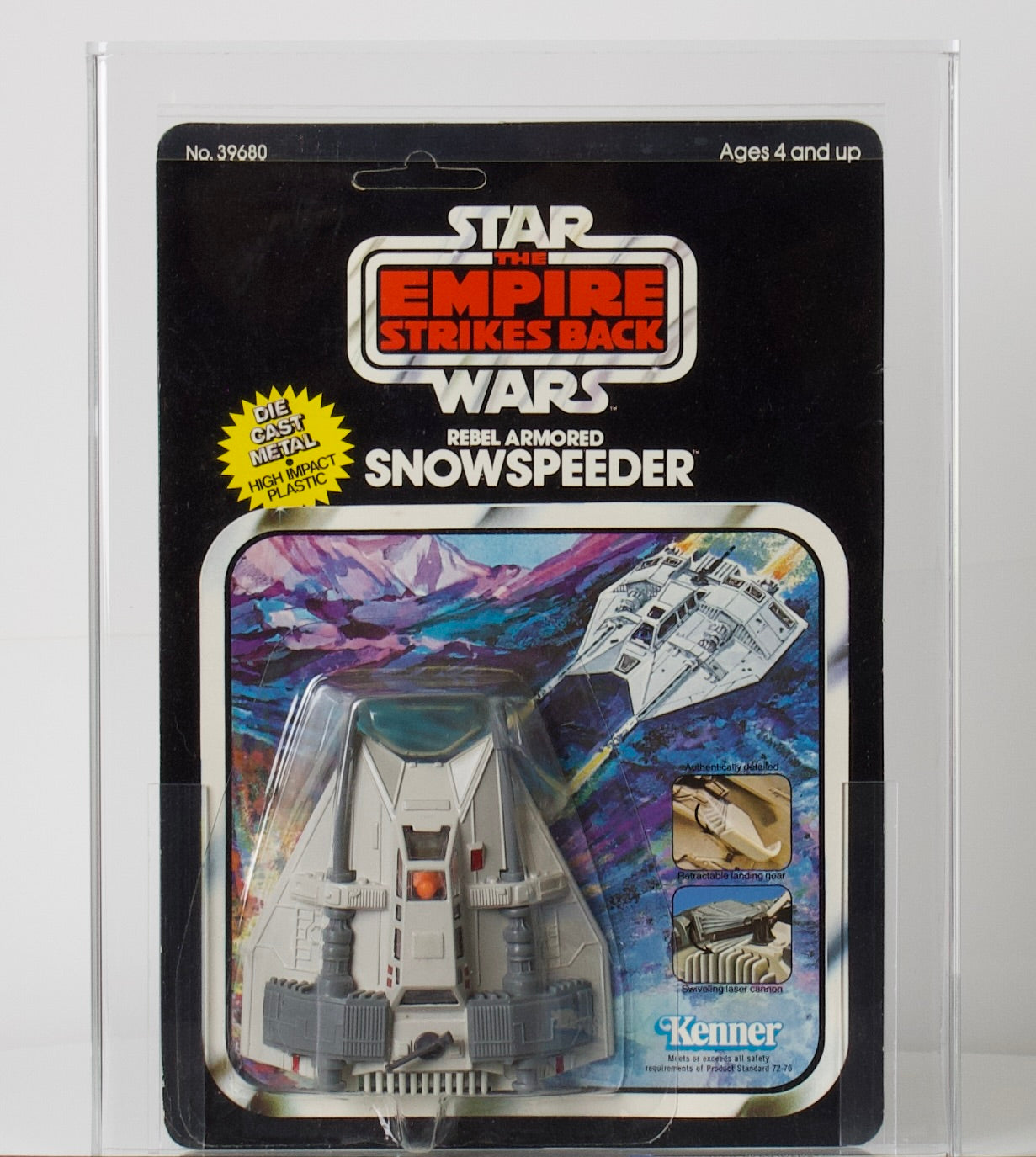 The 1980 release die cast snow speeder is one of the most difficult to find vehicles from the entire Star Wars line in mint condition, due to its size, weight and tendency for its blister to yellow and card to crease.