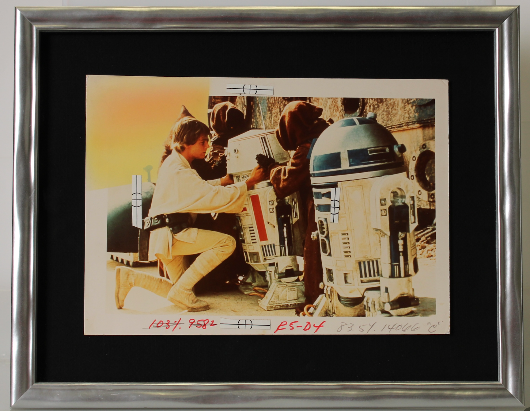 This stunning one of a kind R5-D4 original artwork was created by Kenner's packaging vendor in 1978 to appear on all blister cards for the character between 1978 and 1985. It was photographed, separated into CMYK layers, and then mastered to print Cromalins and then proof cards for R5-D4, before being sent to printing vendors.