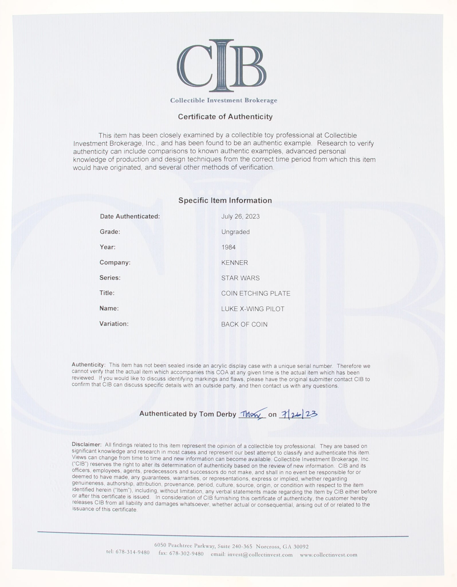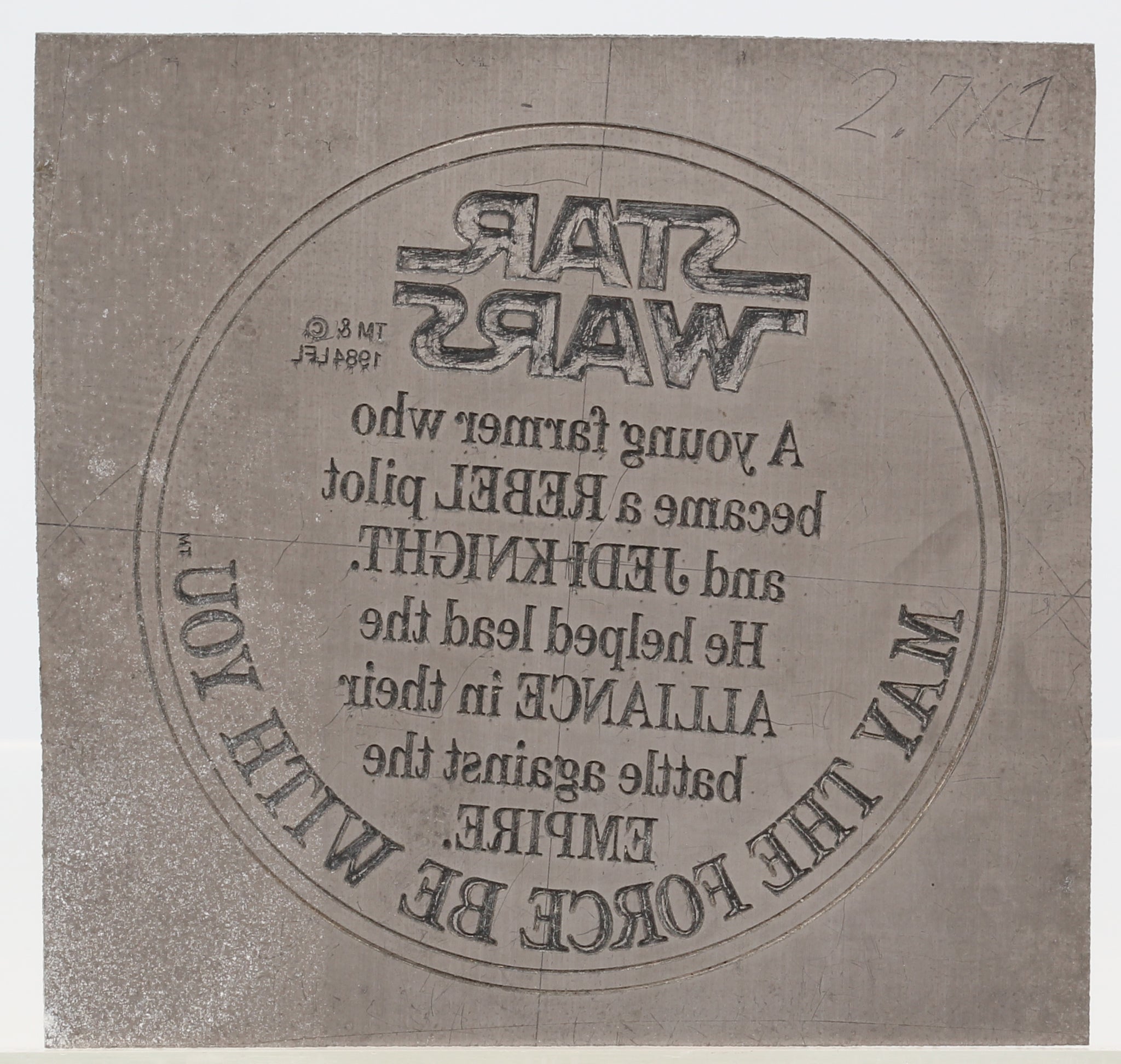 Star Wars 1984 Vintage Kenner Luke X-Wing POTF Coin Etching Plate (Back of Coin). The approximate dimensions of the plate are: 4 9/16" x 4 7/8".